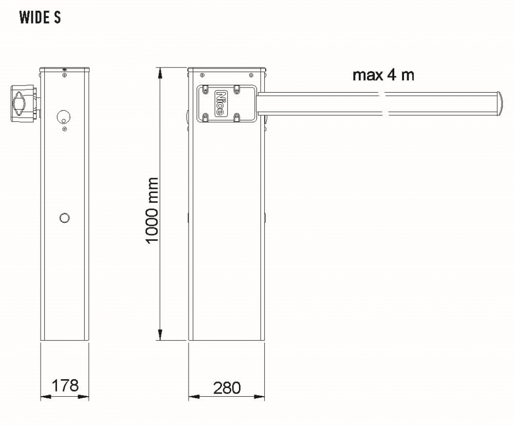 NICE WIDES Тумба шлагбаума WIDES со встроенным блоком управления с интегрированным радиоприемником на 99 пультов Nice (типа FLOR) и монтажным основанием, 24 В, из оцинкованной и окрашенной стали, 280х178х1000 мм. Для стрел длиной до 4 м.
