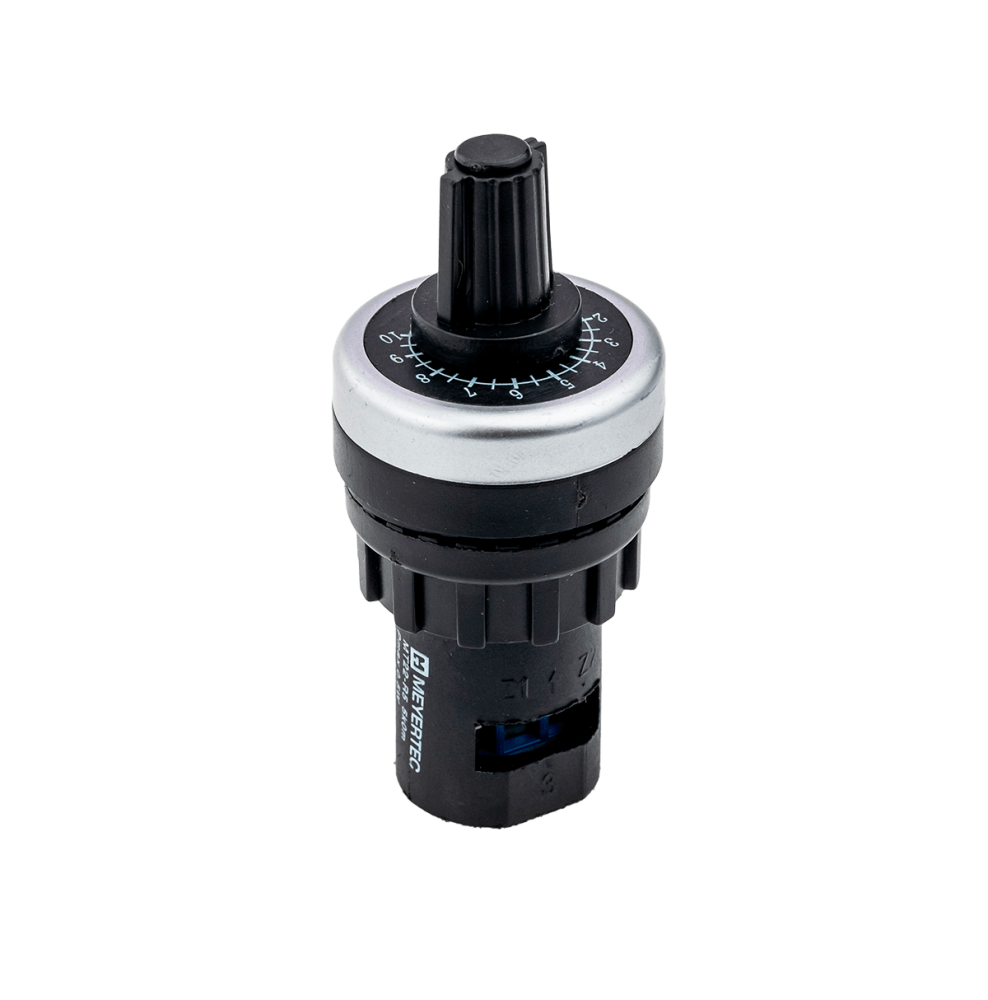 Потенциометры MT22-R10 - переменные резисторы, применяемые для регулировки различных технологических параметров. Одно из основных применений – удаленное управление скоростью вращения электродвигателя через аналоговый вход преобразователя частоты. Потенциометры могут также применяться для регулирования температурного режима, изменения значений напряжения, установки таймера реле времени, регулировки выходного напряжения ТТР.