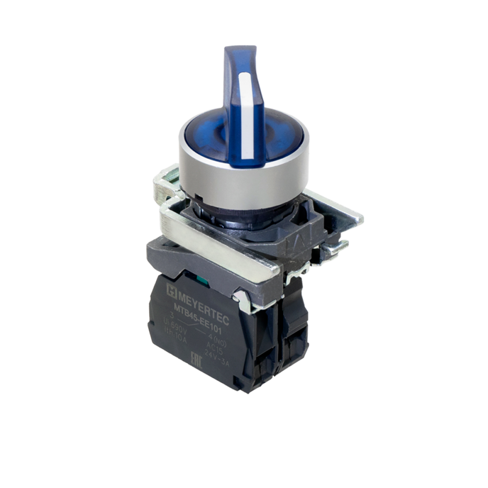 MTB4-BK26713 Переключатель на 2 положения с фиксацией и подсветкой, синий, 1NO, 220V AC/DC, IP65, металл