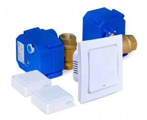Комплект умных устройств «Система защиты от протечек воды»: - 2 беспроводных датчика Ujin Aqua-sense - 2 шаровых крана с электроприводом 1/2 дюйма Ujin Aqua-drive - контроллер протечки Ujin Aqua