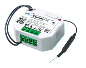 - Коммутатор Ujin Connect-in, установленный внутри монтажной коробки за розеткой или выключателем, позволяет управлять нагрузкой посредством электромагнитного реле и подачи питания. Например, коммутатор дает возможность удалённо включить торшер или другое устройство, включенное в розетку.
