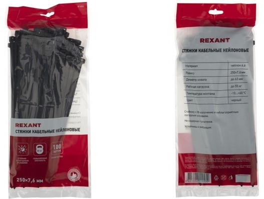 Характеристики 07-0253 ∙ Хомут-стяжка кабельная нейлоновая 250x7,6мм, черная (100 шт/уп) Rexant ∙ кратно 5 упак