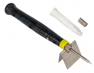 Рукоятка паяльника выполнена из термостойкого пластика, а нагревательный элемент керамический.