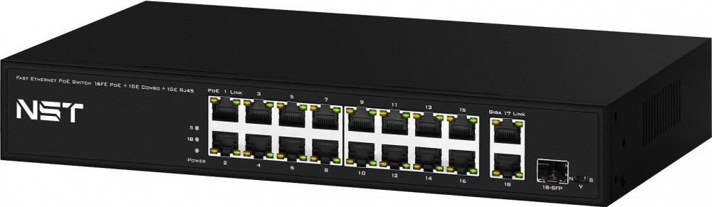 NST NS-SW-16F3G-P PoE коммутатор Fast Ethernet на 16 RJ45 PoE + 1 GE Cobmo + 1 SFP GE порт.