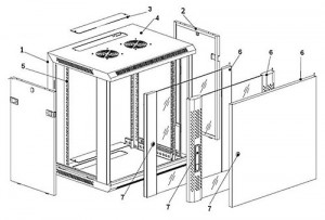 В стандартной конфигурации шкаф оборудован: задней стенкой, передними и задними монтажными профилями и двумя кабельным вводами сверху и снизу. Легкий доступ к установленному оборудованию организован за счет съемных боковых панелей. В шкафу великолепно продумана естественная (пассивная) вентиляция, за счет перфорации в корпусе шкафа и на передней дверце. А так же, конструктивно, предусмотрена установка активной вентиляции.Четыре 19" монтажных L - профиля, имеют юнитовую (U) разметку в соответствии со стандартом DIN 41494-7, глубина установки направляющих может изменяться в зависимости от устанавливаемого оборудования.