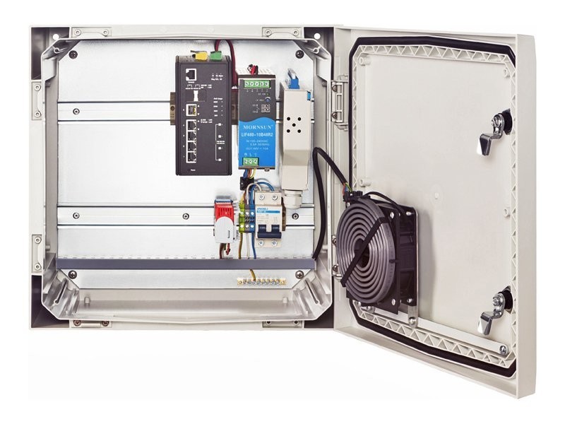 NSBox-4488 (CX12F04F) NSGate Узел Доступа: шкаф NSC-4040F поликарбонат, с вентилятором, с ODF; ИП 48VDC-360W; NIS-3500-5408PGE коммутатор 8 портов TP/1G 802.3bt PoE | 4 SFP/1G uplink