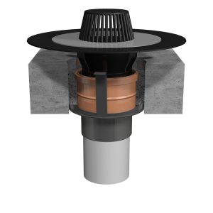 Муфта имеет предел огнестойкости EI-90 для траповых систем и EI-180 – для кровельных воронок.