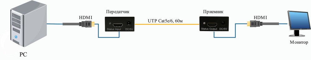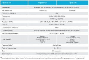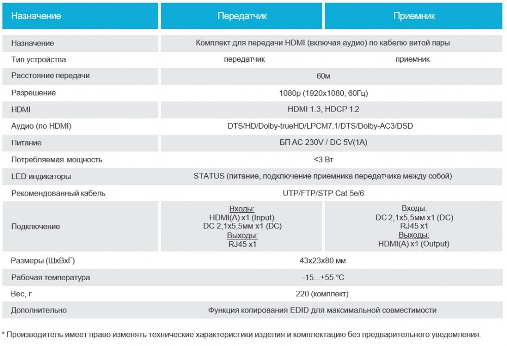 HDMI удлинитель по витой паре до 60м. Разрешение видео - 1920x1080. HDMI 1.3, HDCP 1.2. Поддерживаются кабели cat5e/6. Встроенная антисатическая защита - 8кВ. Порты подключения: HDMI, Ethernet-порт - RJ45. Питание - DC5V. Комплектация: передатчик, приемник, блок питания DC5V - 2шт. Размеры каждого устройства (ШxВxГ):80x23x43мм. Рабочая температура: -15…+55°С.